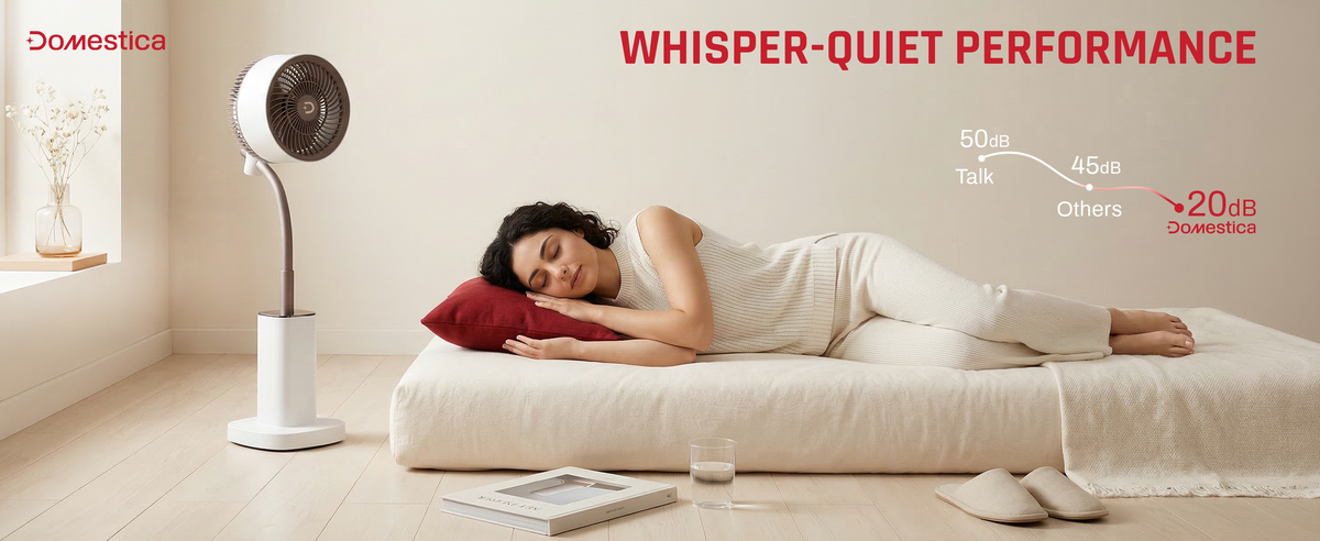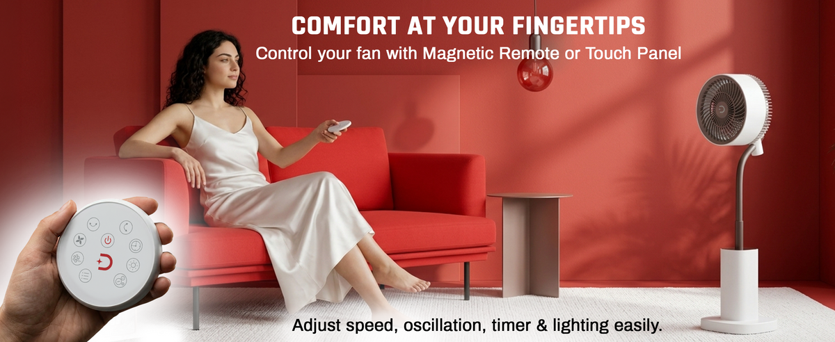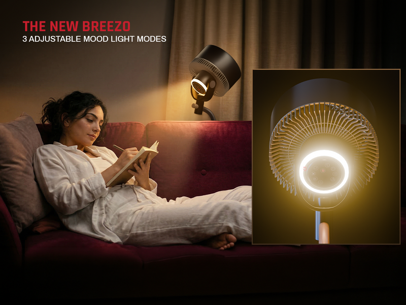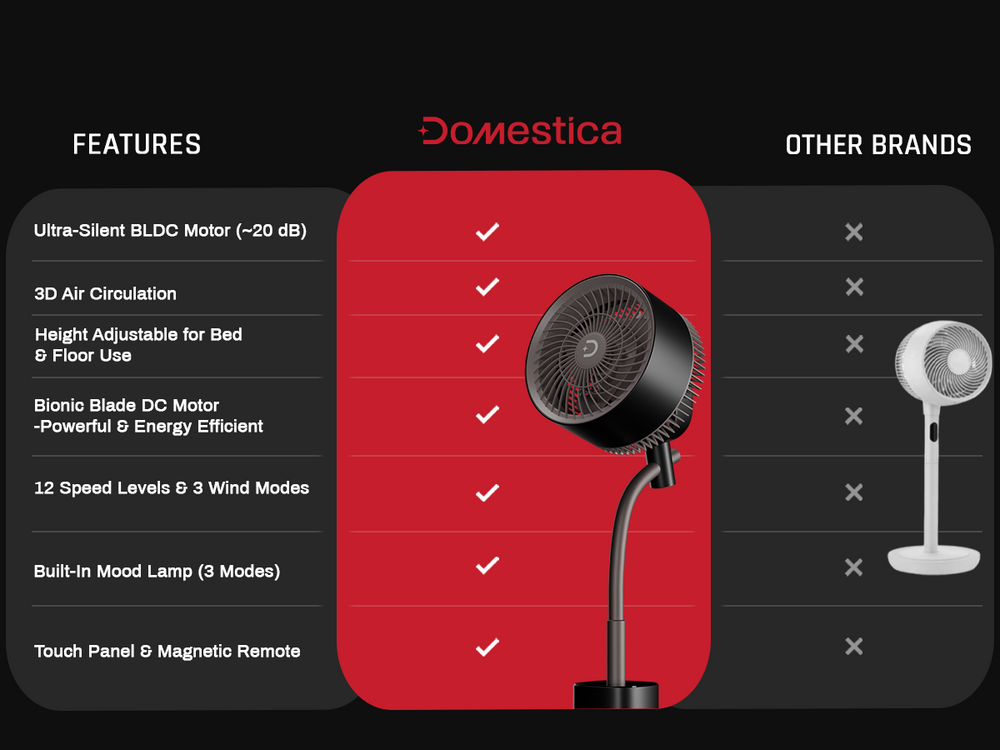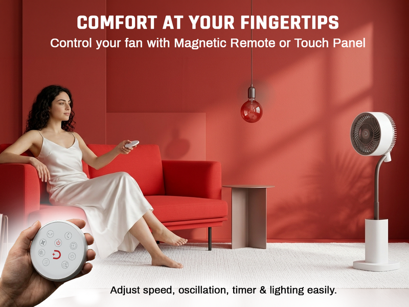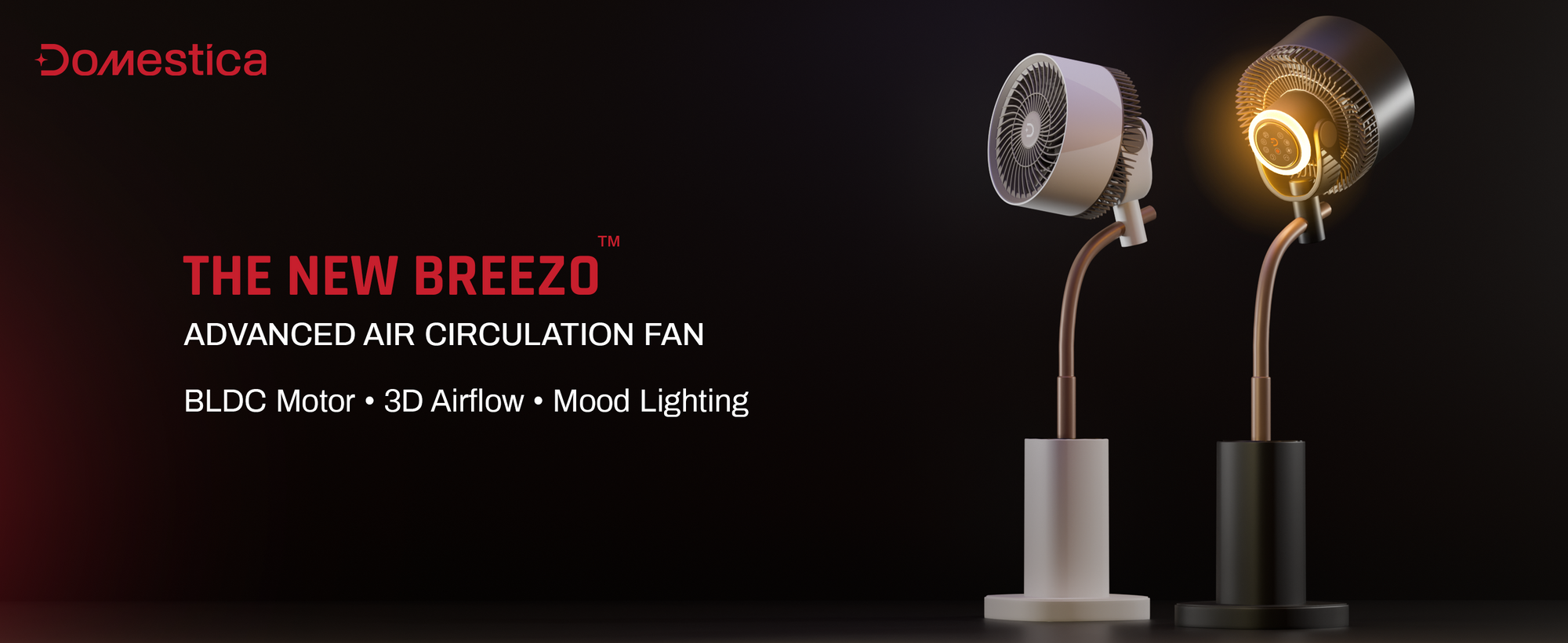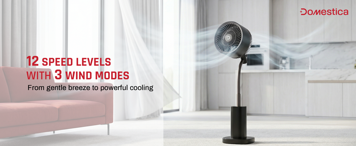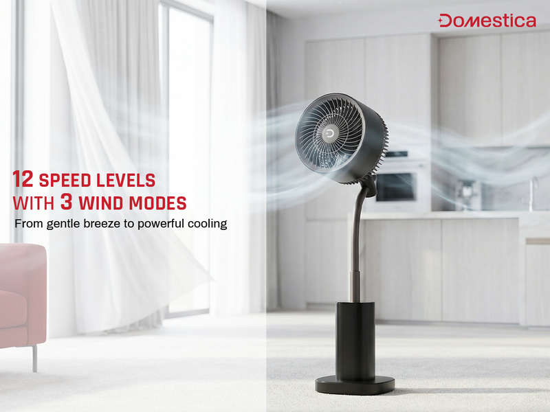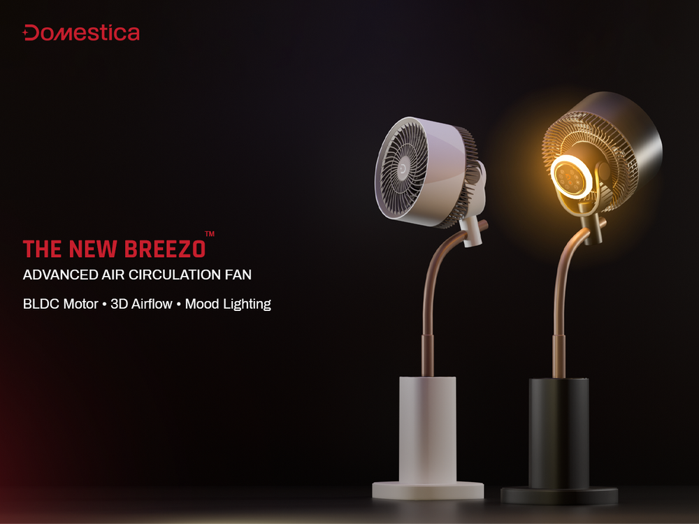 The Domestica Breezo 3D Air Circulation Tower Fan with mood lamp, height-adjustable stand, touch panel and remote control delivers 120° horizontal and 90° vertical oscillation for room-wide cooling. It uses a silent BLDC motor with multiple speeds and modes, plus a built-in mood lamp for added ambience.