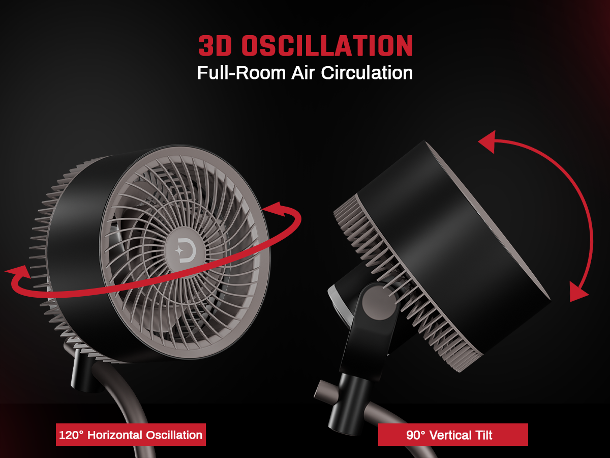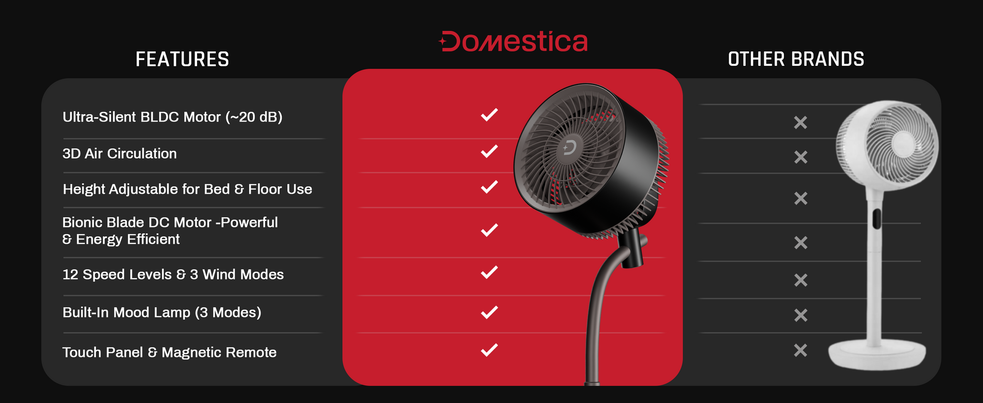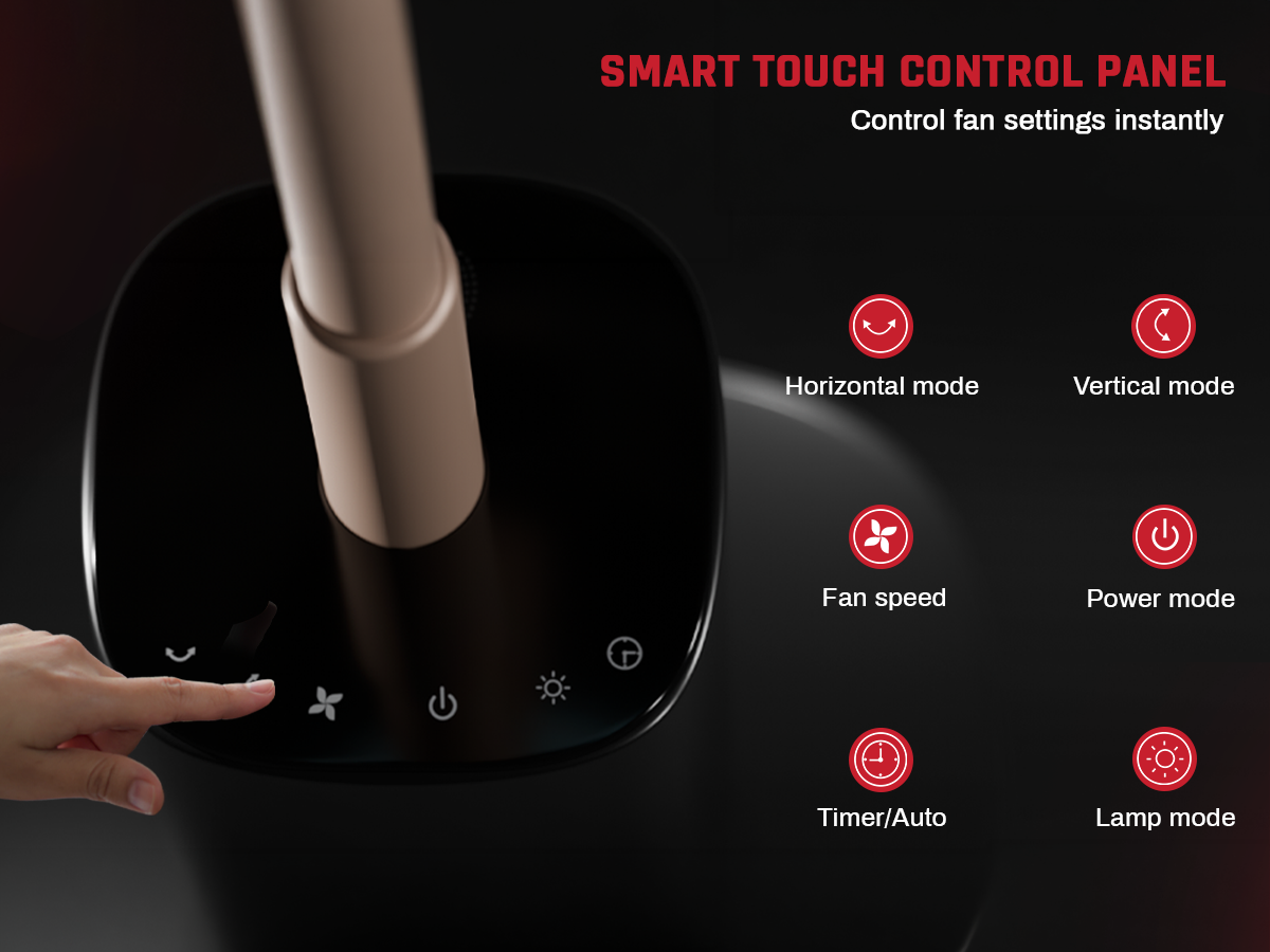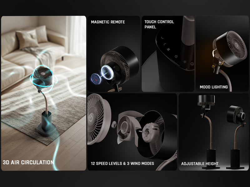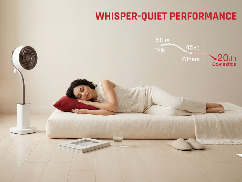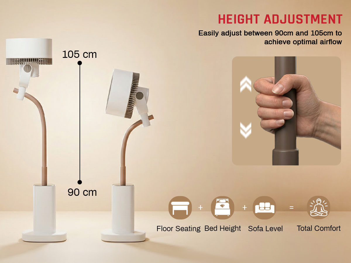 The Domestica Breezo 3D Air Circulation Tower Fan with mood lamp, height-adjustable stand, touch panel and remote control delivers 120° horizontal and 90° vertical oscillation for room-wide cooling. It uses a silent BLDC motor with multiple speeds and modes, plus a built-in mood lamp for added ambience.